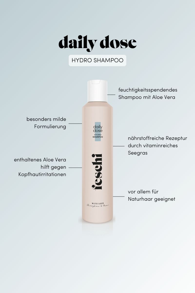 Thirsty hair? Nicht mehr lang! Unser daily dose – Hydro Shampoo mit Extrafeuchtigkeit stillt den Durst deiner Haare. Die sanfte Rezeptur ist der perfekte Frischekick für trockenes Naturhaar. Top Inhaltsstoffe: Seegras und Aloe Vera. Das milde, hydratisierende Dreamteam mit wertvollen Vitaminen, Aminosäuren und Proteinen hat eine Spezialmission – die Haare mit Feuchtigkeit versorgen. Schon eine kleine „daily dose“ hinterlässt große Spuren. Sofort spendet sie extra viel Feuchtigkeit für die Haare. Sie werden super soft, geschmeidig und gesund. So sehen #hairgoals aus.