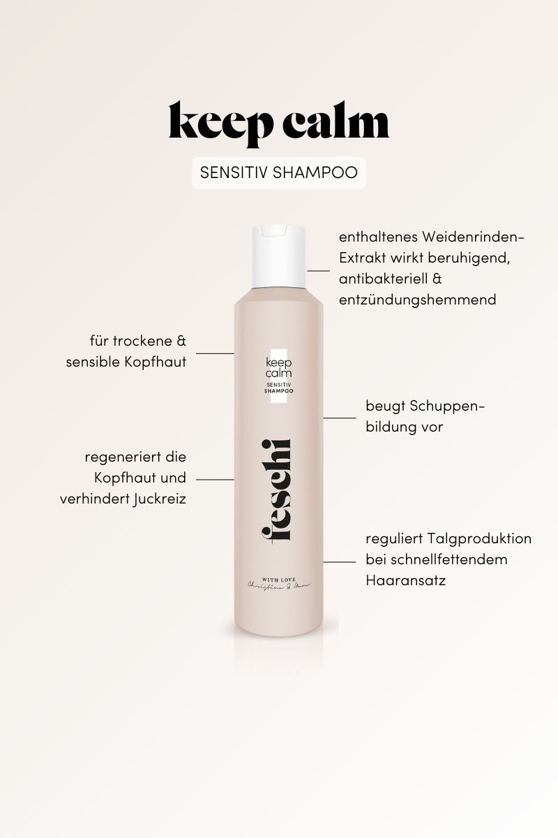 Wenn du unter besonders sensibler Kopfhaut leidest und eine intensive Pflege benötigst, empfehlen wir dir auch unser keep calm – Sensitiv Tonic auszuprobieren. Mit dieser Produktkombination bekommst du selbst sehr sensible Kopfhaut wieder in den Griff.