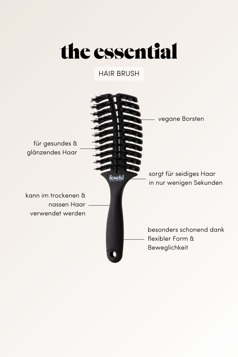 Die essential – Hair Brush ist, wie der Name schon sagt, ein absolutes Must-Have für alle, die Wert auf gesundes und gepflegtes Haar legen. Mit ihren hochwertigen, schonenden und veganen Borsten entwirrt sie mühelos Knoten, ohne das Haar zu strapazieren. Das ergonomische Design sorgt für einen angenehmen Griff und passt sich zudem perfekt an deine Kopfhaut an. Die Haarbürste ist für alle Haartypen geeignet und fördert die natürliche Haarstruktur. Verabschiede dich von Frizz und Haarbruch und erlebe geschmeidiges, glänzendes Haar jeden Tag. Du kannst die Haarbürste sowohl im nassen als auch im trockenen Haar anwenden!